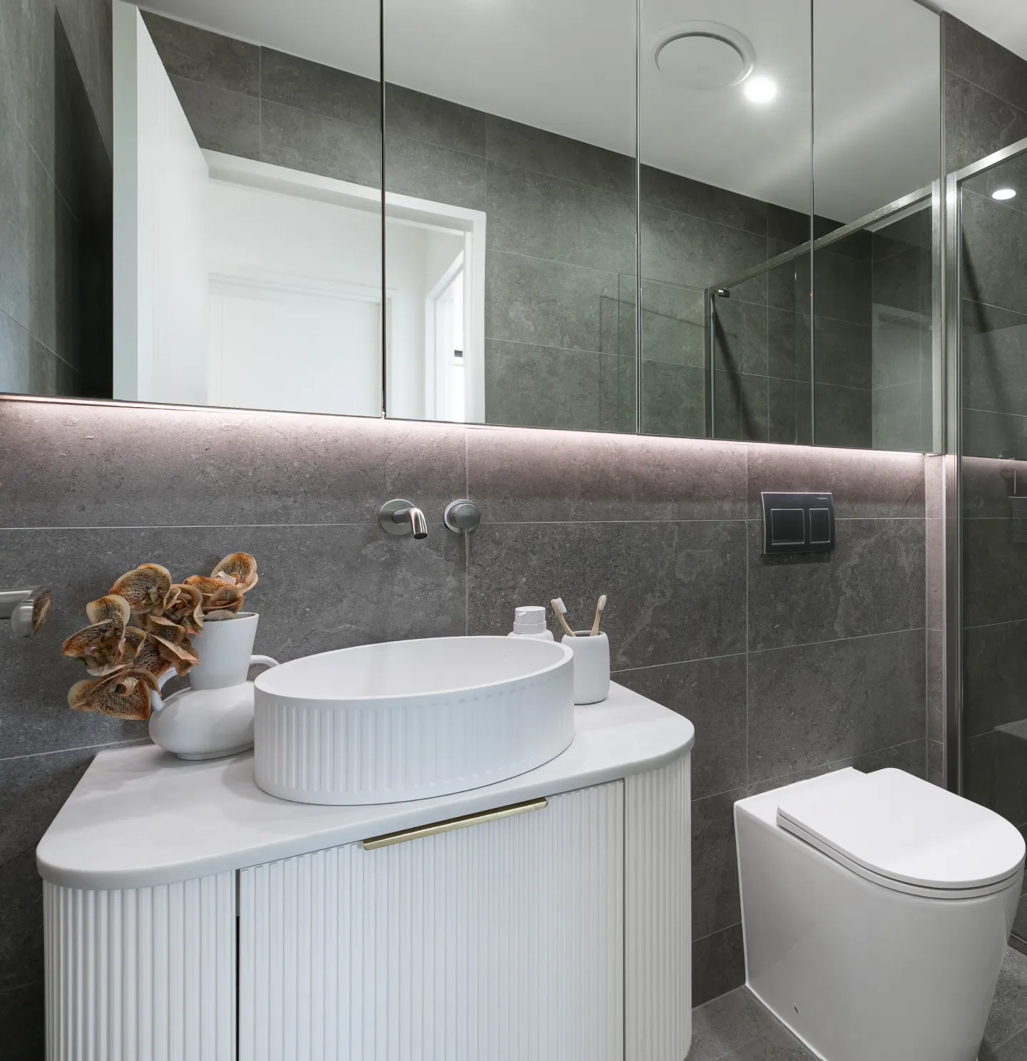 Clean lines and a minimalist design aesthetic define the stunning bathrooms, with grey stone-look floor and wall tiles creating a calming mood, enhanced by ambient under-lit mirrored cabinetry and streamlined wall-hung vanities. Putting the finishing touches on the spaces, including beautiful contemporary tapware, shower mixers, shower heads and towel rails.